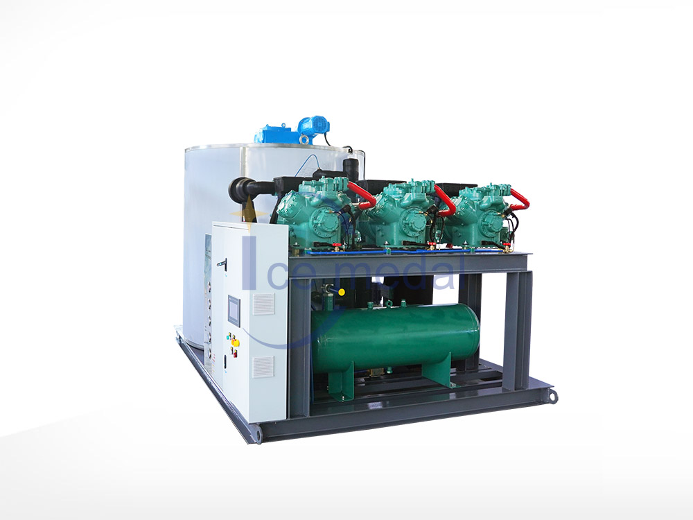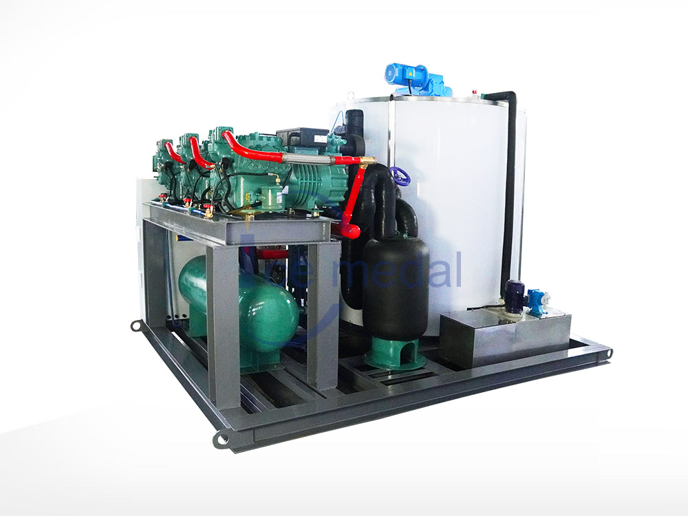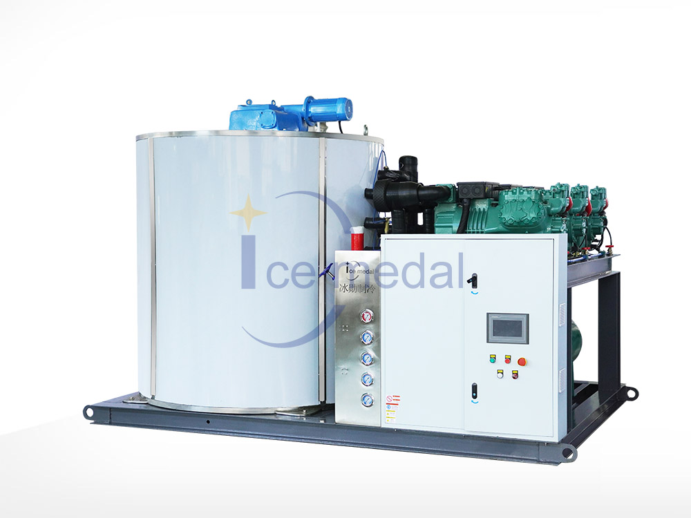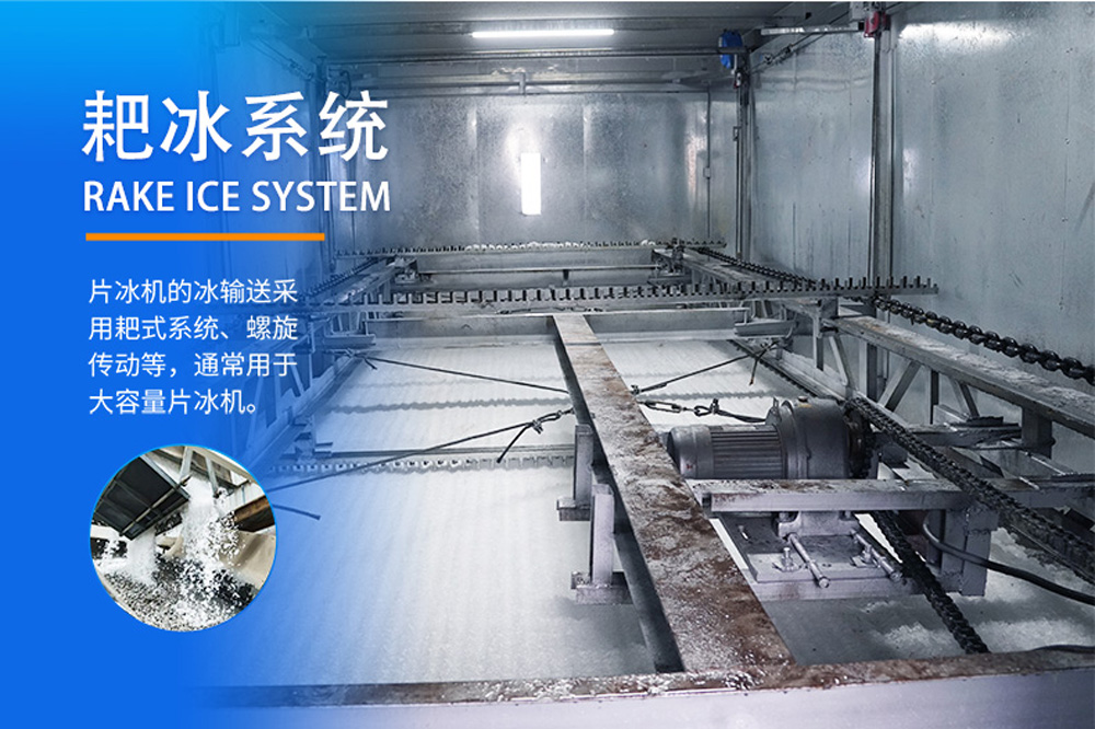 30噸24小時片冰機(jī)廣泛應(yīng)用于海港魚類冷卻、混凝土加冰降溫等。片冰機(jī)采用立式螺旋切冰蒸發(fā)器。制冰時水要均勻,通過分水裝置分布到冰桶內(nèi)壁。該系統(tǒng)由集裝箱式片冰機(jī)、帶耙系統(tǒng)的冷庫組成。
